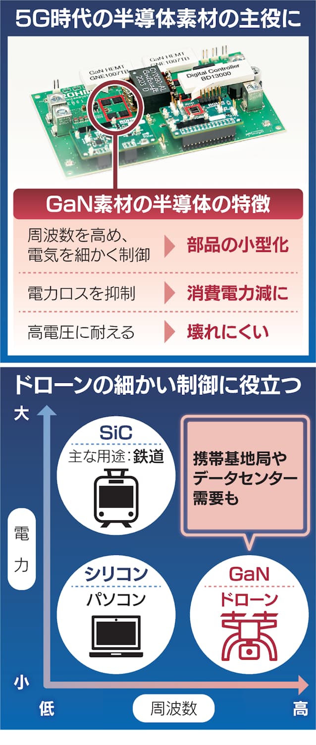 同じくパワー半導体の一種であるシリコンを使った半導体は制御に伴い電力のロスが発生しやすい欠点があるが、GaNはそれが抑えられる。SiCは高電圧や大電力が求められる電車や電気自動車(EV)といった用途に向いている一方、GaNは高頻度で電流のオン・オフが求められるデータセンターや通信基地局でも強みを発揮できるとみられる。