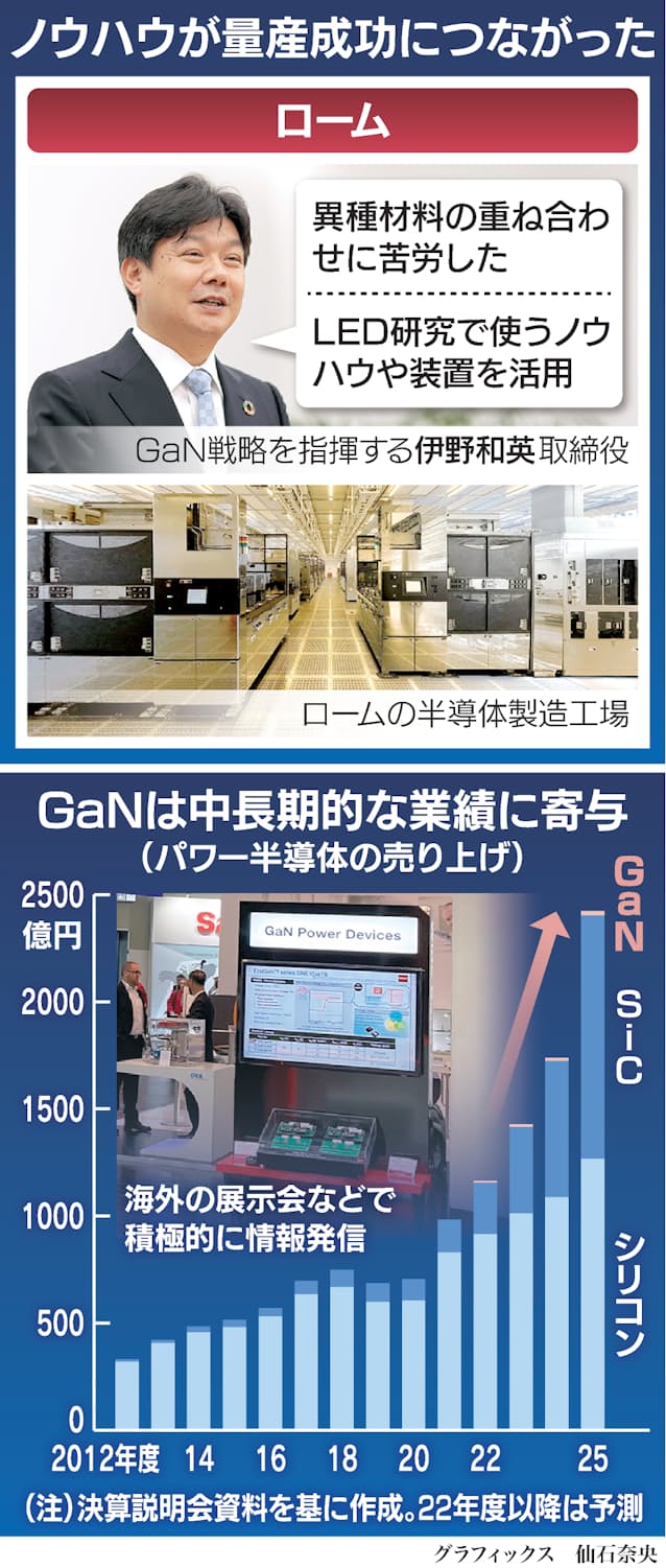 そうした中でパワー半導体は日本勢が今も約3割のシェアを持つ。GaNなど化合物の素材開発などの知見が必要なため研究で先行している優位性を生かしやすい。ロームは市場が立ち上がる前に量産体制をつくり今後本格化する海外勢との競争に備える。
