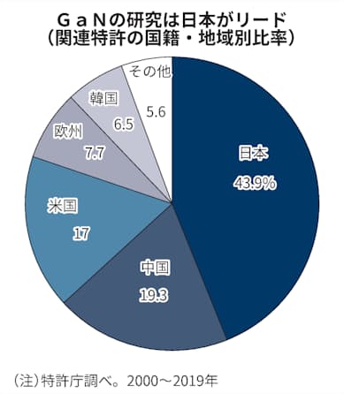 半導体の材料となる窒化ガリウムの基板では、三菱ケミカルや住友化学、住友電気工業などの日本企業が世界で存在感を示す。特許庁のGaNパワーデバイスの出願件数を国籍・地域別でみると、日本が全体の43.9%を占めており、中国や米国に大きく差を付ける。