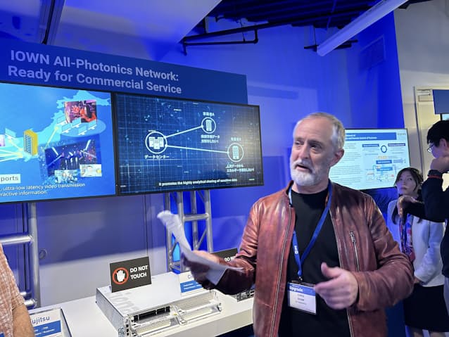 IOWNは会場の目立つ場所に展示ブースを構え、英国と米国での実証実験の結果も発表した。英国では約89キロメートル、米国では約4キロメートル離れたデータセンターを1000分の1秒以内というわずかな時間差でつなぎ、一つのインフラのように運用できたという。