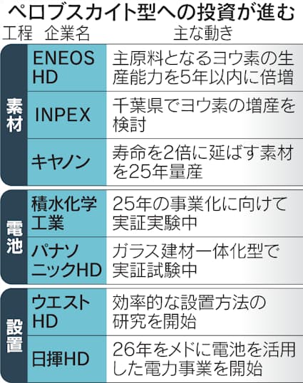 ペロブスカイト型は積水化学工業や東芝、パナソニックHDが太陽電池を完成品として製造し、キヤノンやENEOSHD、INPEXなどが原料や機能性素材を供給する。日揮HDはペロブスカイト型を工場や物量倉庫などに設置し、26年をめどに電力事業を始める。