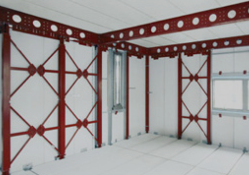 私のショールームは、ヘーベルハウスの標準仕様をベースに竣工後(内壁漆喰塗りは断熱施工後)に石膏ボード内壁に穴を開けセルロースファイバーを吹き込んでいるので、制震フレームの筋交い(⇓画像)が邪魔して残念ながら隙間のあ不完全な断熱状態になっています。