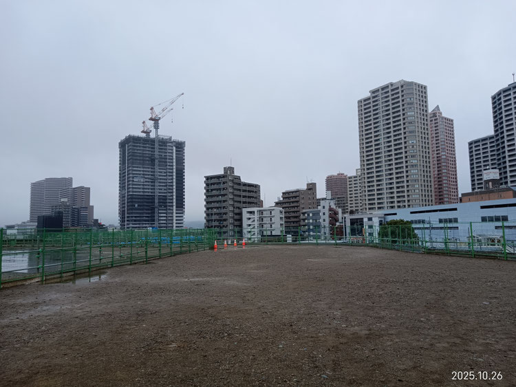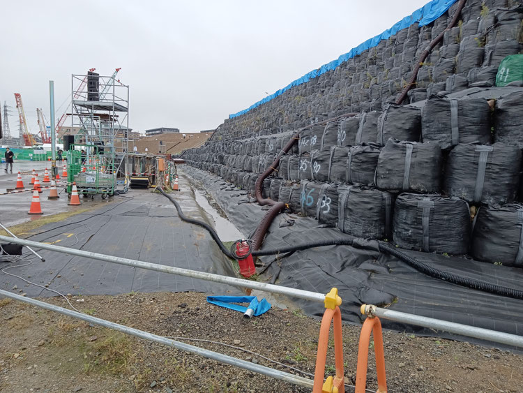 掘り起こされた土砂は広大な敷地内に積み上げられ、一部は黒い袋に入れて急勾配のバンクを形成してました。